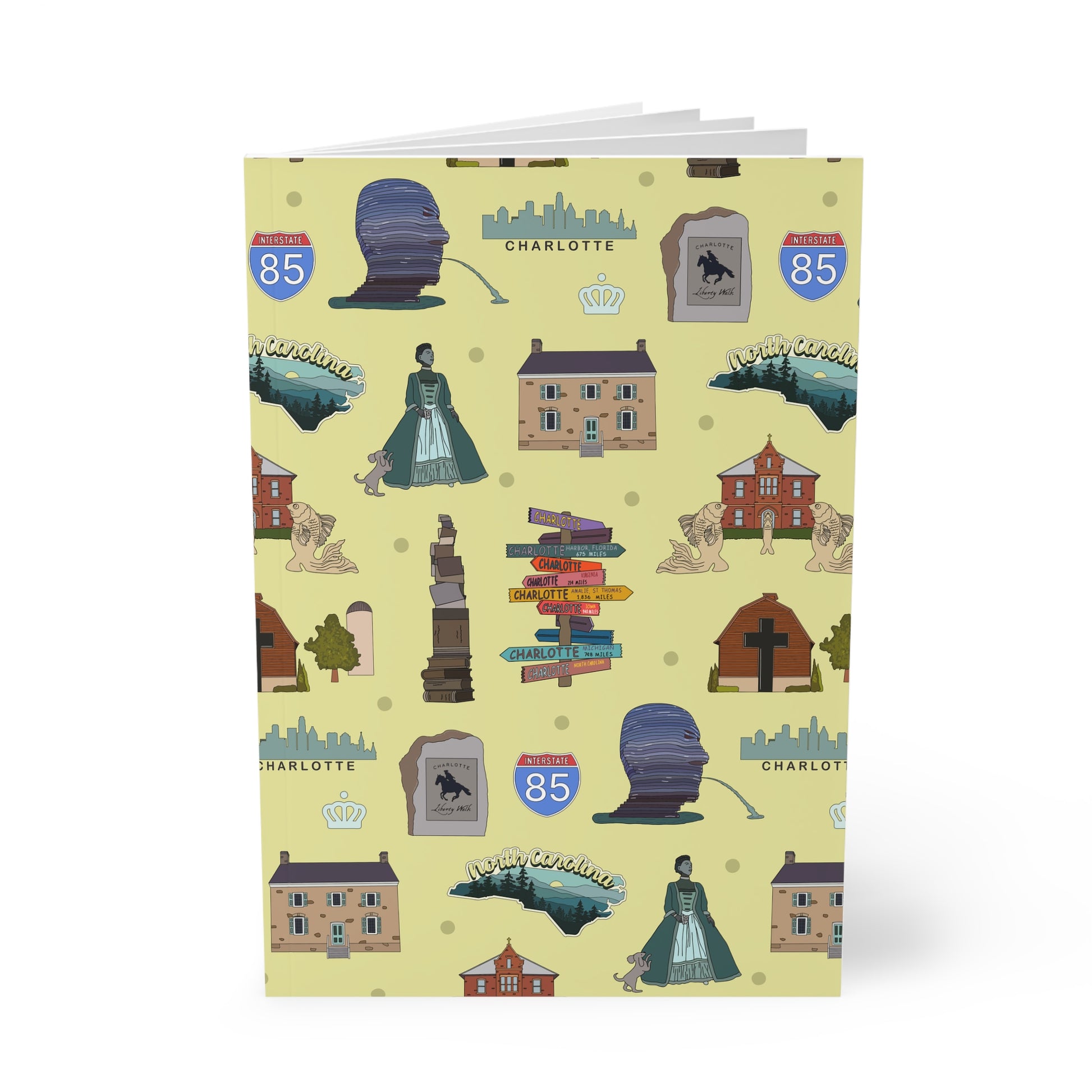 Paperback notebook with Charlotte, North Carolina NC landmarks in brass 150 lined pages
